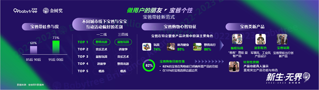 95后、00后宝爸带娃参与度显著提升,解锁更多“宝爸带娃新范式”,在玩具、体育健身、野营出行等特定婴童产品决策中扮演主要角色,编程玩具、迷彩配色、宝爸站凳成为宝爸类新产品。数据同时显示,高低线城市的宝爸在野营出游、音乐艺术、益智玩具、讲故事等亲子互动活动方面也都参与更多。