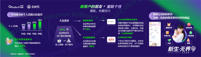 新生代宝妈个性鲜明,“爱娃,也爱自己”,时尚化、半定制化需求成为标配,报告显示孕育期宝妈个人花销占比提升,这也给新锐品牌带来产品和营销创新的机会。期间,宝宝树能够准确记录妈妈状态,为每一位妈妈精准推荐内容和商品。