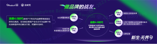 消费4.0时代是用户个性化向品牌管理者提出的综合挑战,宝宝树及复星产业生态坚决做品牌的战友,致力于为品牌个性化创新提供综合解决方案。宝宝树将以“智能化平台”“裂变式渠道”“合伙式研发”“共创式供应链”“互动式营销”等创新多元模式,助力合作伙伴形成消费4.0时代的“智能用户运营核心”及“数字化价值链闭环”,并整合生态资源为品牌提供高价值的用户运营、精准的研发创新和全域渠道拓展等定制化的综合解决方案。